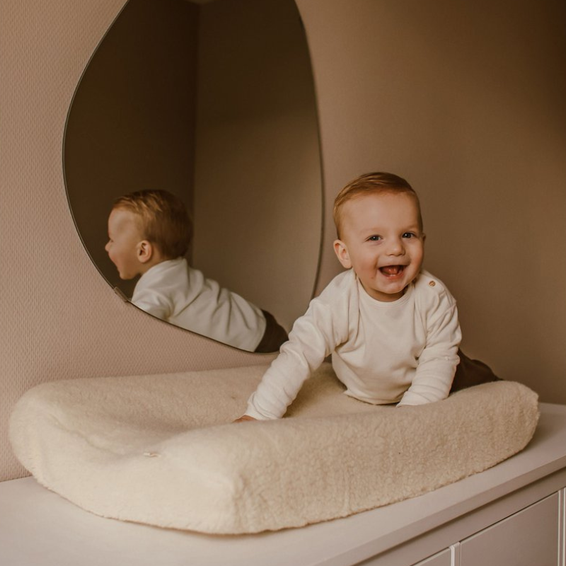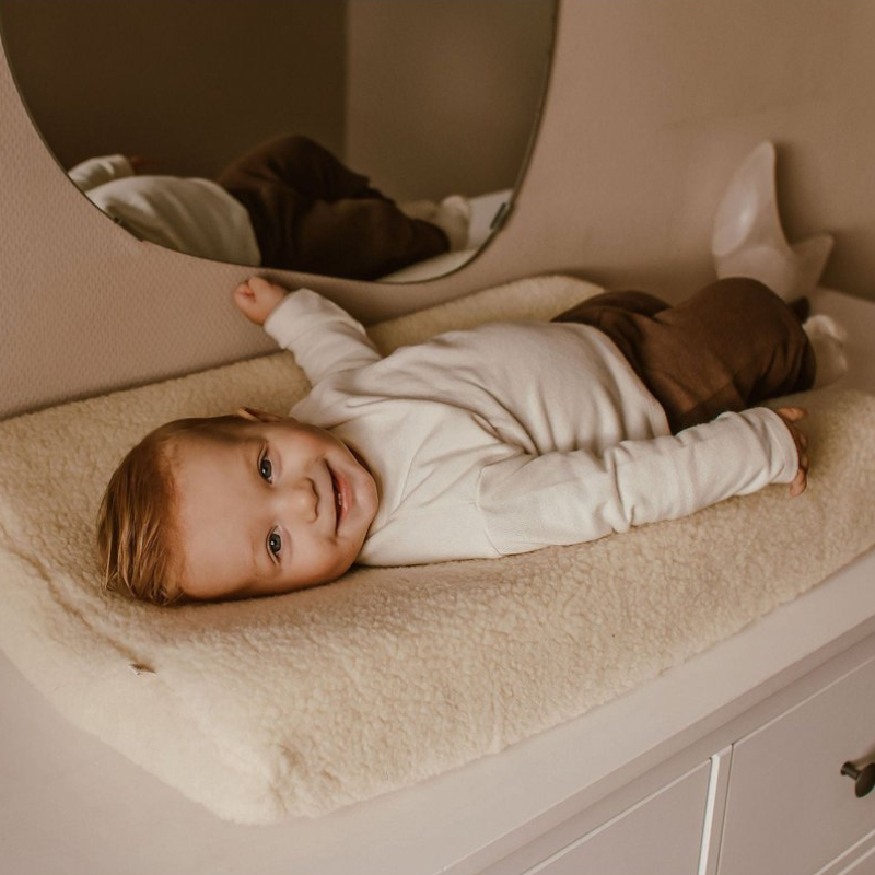 Det kan føles køligt for baby at blive lagt på en kold pude og få det varme tøj af, men med et overtræk til puslepuden i 100% børstet merinould, er babys underlag altid dejligt rart. Ulden isolerer med det samme og bleskiftet bliver endnu hyggeligere.
